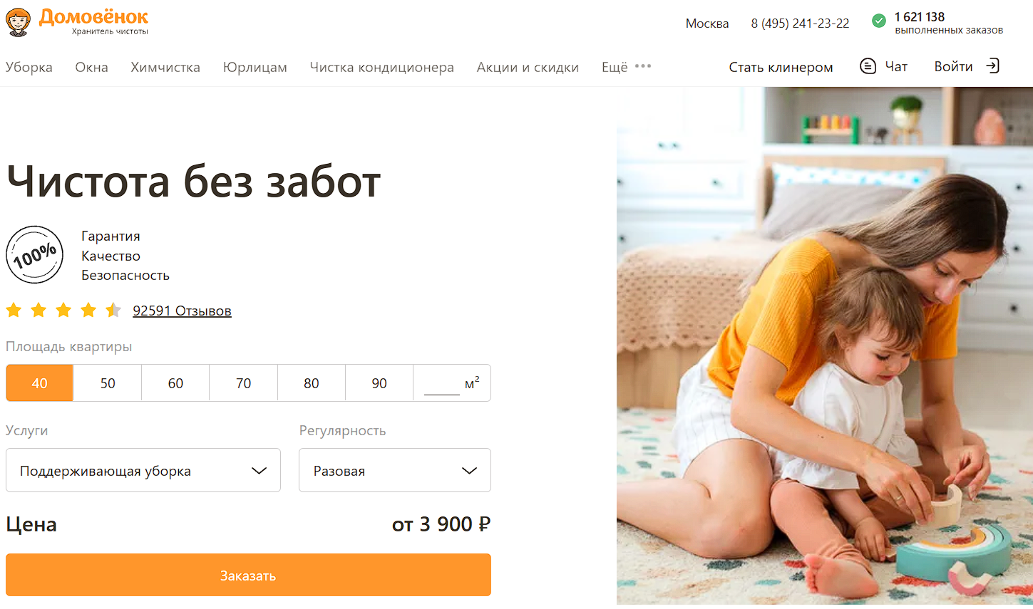 Федеральная компания с присутствием в Москве, Петербурге и Нижнем Новгороде, более 90 000 клиентов и собственная линейка ЭКО-средств. Для тех, кто привык заказывать такси в два касания, формат знакомый: Домовенок единственная компания рейтинга с полноценным мобильным приложением для iOS и Android, где можно управлять заказами, выбирать клинера.