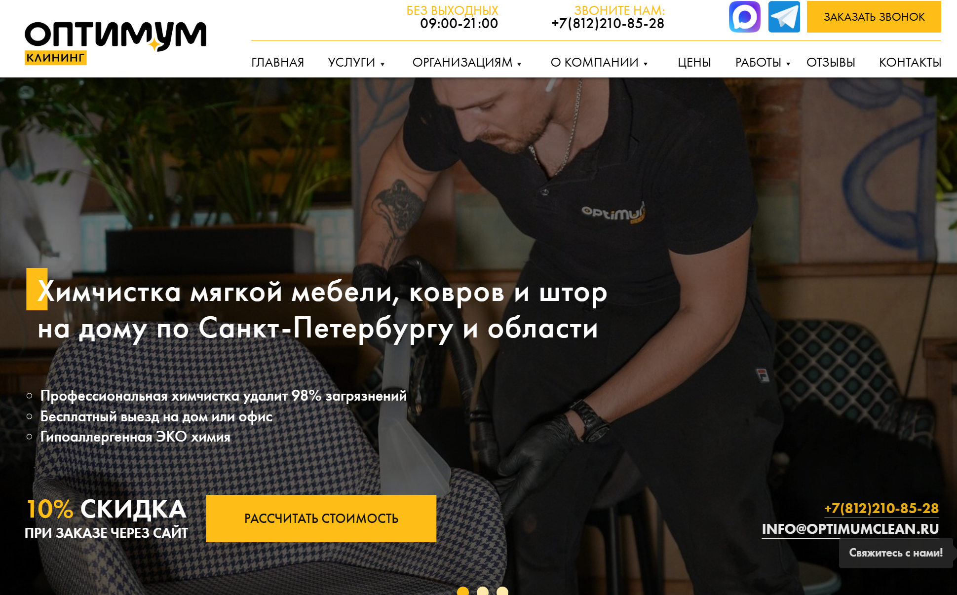 Optimum Clean – компания, у которой уборка и химчистка мебели работают как единая услуга. Экстракторная и паровая чистка, европейские гипоаллергенные составы – подходит для семей с детьми и аллергиков. В отзывах часто встречаются истории о спасенных диванах и коврах, которые хозяева уже собирались выбрасывать: въевшиеся пятна от кофе, детского питания, следы животных.