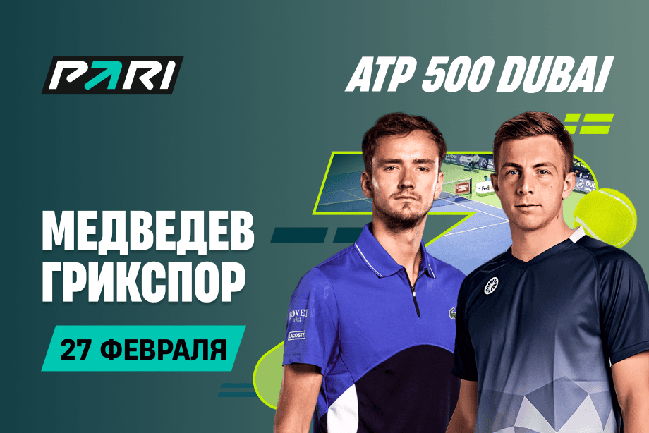 27 февраля россиянин Даниил Медведев сыграет в матче 1/4 финала турнира ATP 500 в Дубае с представителем Нидерландов Таллоном Грикспором. Встреча начнется в 18:00 мск. Аналитики букмекерской компании PARI оценили шансы теннисистов в предстоящей встрече.