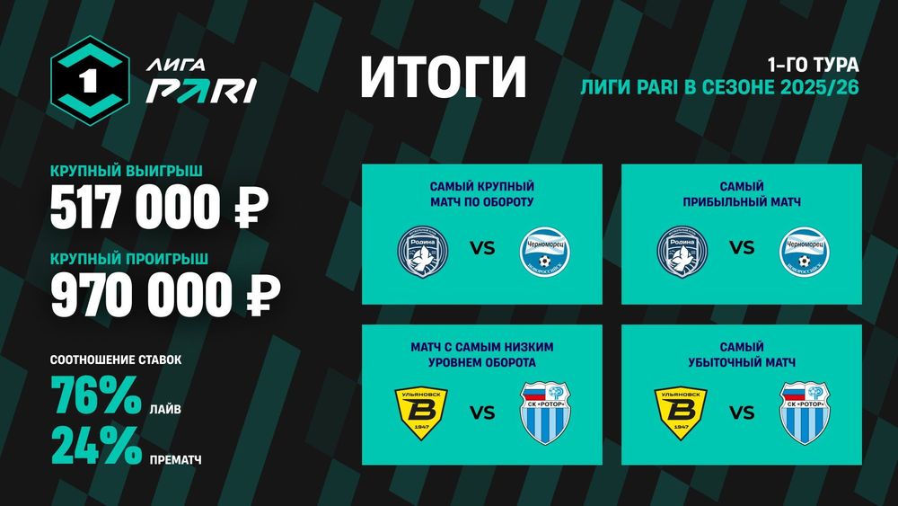 Самым крупным матчем по объему принятых ставок в первом туре Лиги PARI стала встреча между «Родиной» и «Черноморцем». На эту игру пришлось почти 33% от всего оборота пари на игры первого тура Лиги PARI. Встреча завершилась со счетом 1:1. Команды забили свои голы за первые 25 минут, но в дальнейшем отличились только обилием желтых карточек.