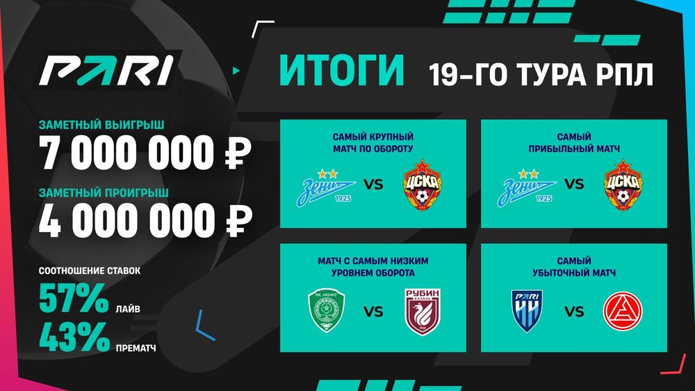 Больше всего ставок в денежном выражении пришлось на матчи «Зенит» — ЦСКА и «Динамо» Махачкала — «Локомотив». На эти встречи пришлось больше 18% от общего оборота пари на 19-й тур РПЛ. Кроме того, клиенты PARI активно ставили на матч «Краснодара» с «Крыльями Советов». Меньше всего игроки заключали пари на матчи «Пари НН» — «Акрон» (2:1), «Химки» — «Факел» (1:0) и «Ахмат» — «Рубин» (2:1).