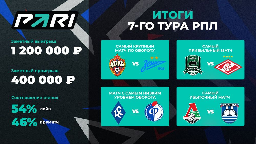 Один из самых крупных выигрышей на матчах седьмого тура составил 1 200 000 рублей. Клиент PARI поставил полмиллиона рублей на то, что «Зенит» не проиграет ЦСКА, а общий тотал встречи составит меньше 2.5. Ставка была принята с коэффициентом 2.40. Все сошлось, и игрок получил чистый выигрыш в размере 700 000 рублей. Крупнейший проигрыш также пришелся на встречу ЦСКА с «Зенитом» и составил 400 000 рублей — автор пари верил в победу гостей.