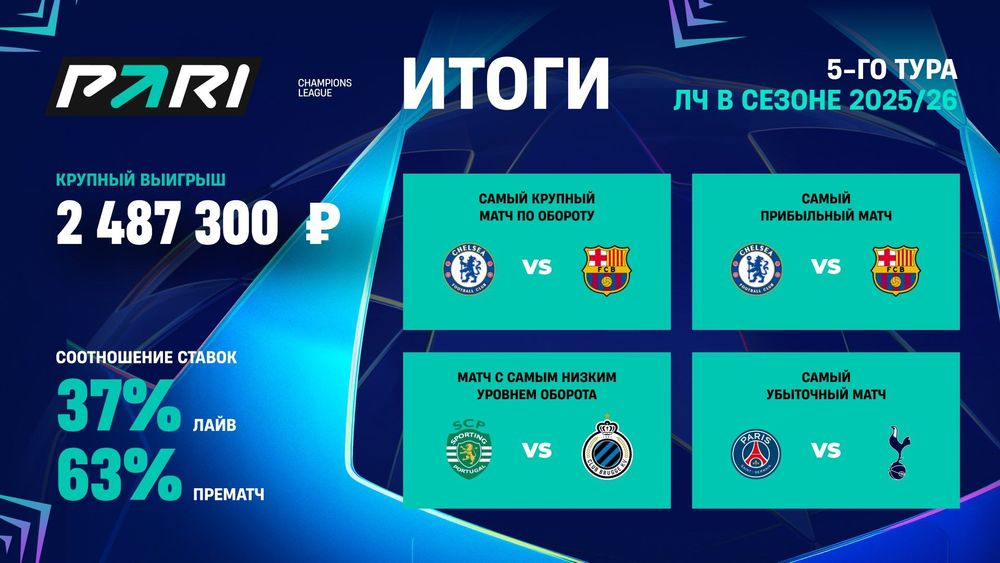 25–26 ноября прошли матчи пятого тура общего этапа Лиги чемпионов в сезоне-2025/26. Директор букмекерской компании PARI по коммуникациям и устойчивому развитию Алексей Бабичев рассказал о самых популярных и прибыльных встречах этой стадии турнира.