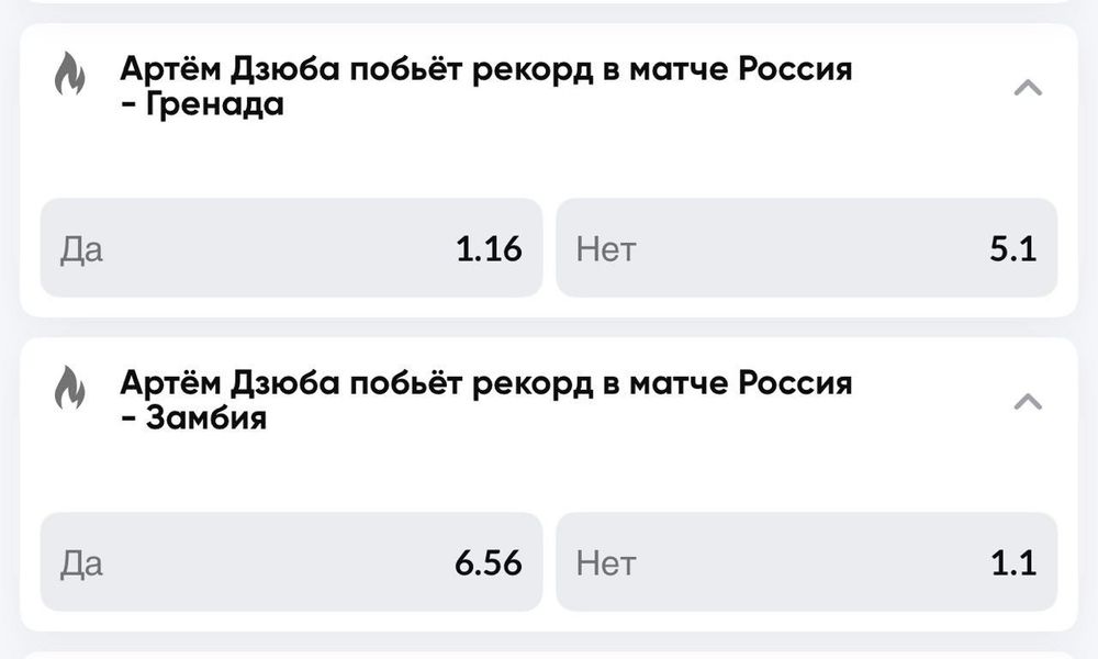 BetBoom предлагает пользователям выбрать, в каком из матчей Дзюба станет главным бомбардиром национальной команды. Кроме ближайших BetBoom Матчей Сборной, также можно поставить на падение рекорда в рамках июньских игр с Нигерией (кф 25.00) и Беларусью (кф 35.00).