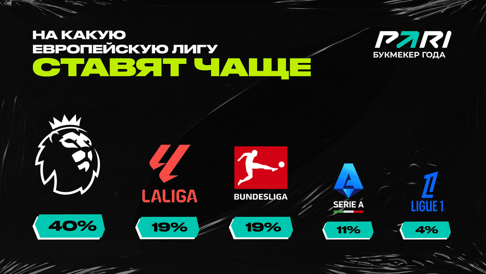 На Англию чаще всего игроки делают ставки — АПЛ назвали 40% опрошенных. По 19% ставят на испанскую и немецкую лиги, 11% выбрали Италию. 8% предпочитают чемпионаты за пределами топ-5, 4% — первенство Франции.