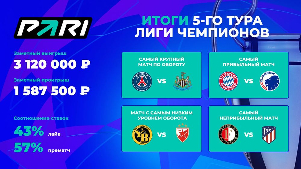 Самым успешным для PARI стал матч «Баварии» с «Копенгагеном», на который приходится 19% прибыли по ставкам, принятым на встречи пятого тура ЛЧ. Первая игра команд завершилась победой баварцев со счетом 2:1, поэтому букмекеры и игроки ожидали, что на своем поле подопечные Томаса Тухеля победят еще более уверенно. Исход встречи стал неожиданностью для всех. Хотя «Бавария» больше владела мячом, ей так и не удалось забить. «Копенгаген» также не смог продавить оборону противника, и в итоге была зафиксирована нулевая ничья.