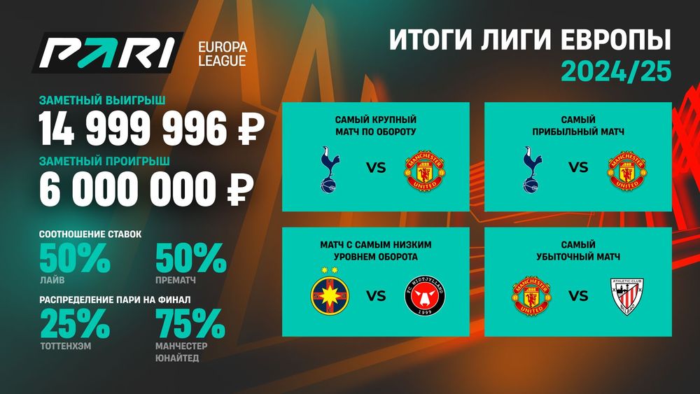 Букмекерская компания PARI подвела итоги сезона Лиги Европы 2024/25, победу в котором одержал «Тоттенхэм». Директор департамента устойчивого развития и интегрированных коммуникаций PARI Алексей Бабичев рассказал, какие из матчей главного еврокубка стали самыми прибыльными и убыточными для букмекерской компании и клиентов.