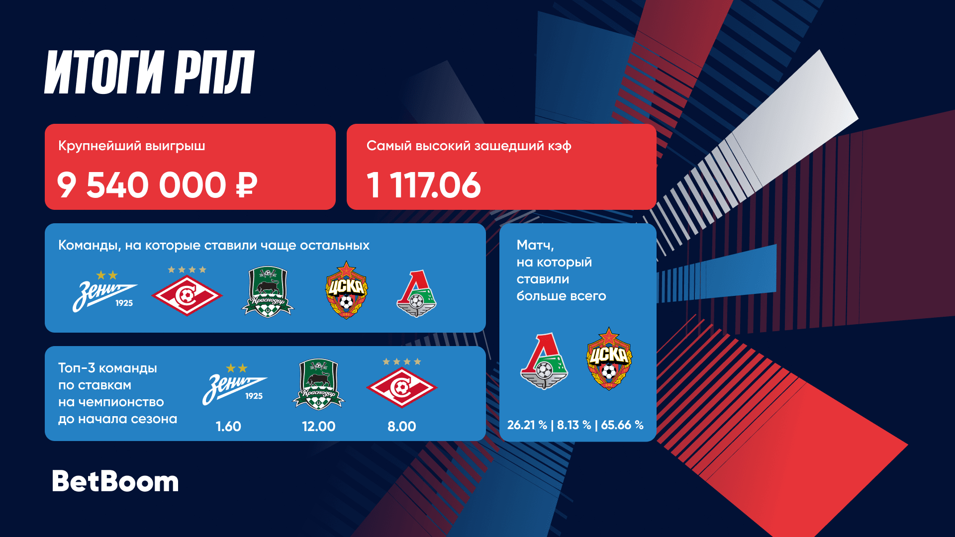 Главными претендентами на победу в чемпионате по мнению пользователей BetBoom стали «Зенит», «Краснодар» и «Спартак». Отметим, что из этой тройки победа команды Мусаева в РПЛ шла с самым высоким коэффициентом. BetBoom давал на чемпионство «Краснодар» кф 12, тогда как золото «Зенита» и «Спартака» были за 1.6 и 8 соответственно. Сезон получился довольно конкурентным – за 30 туров лидер чемпионата сменился восемь раз. Но главное противостояние в сезоне было между «Зенитом» и «Краснодаром». После шестого тура обе команды не покидали первую тройку таблицы, а по итогам сезона подопечные Мусаева выиграли чемпионство с разницей в одно очко.