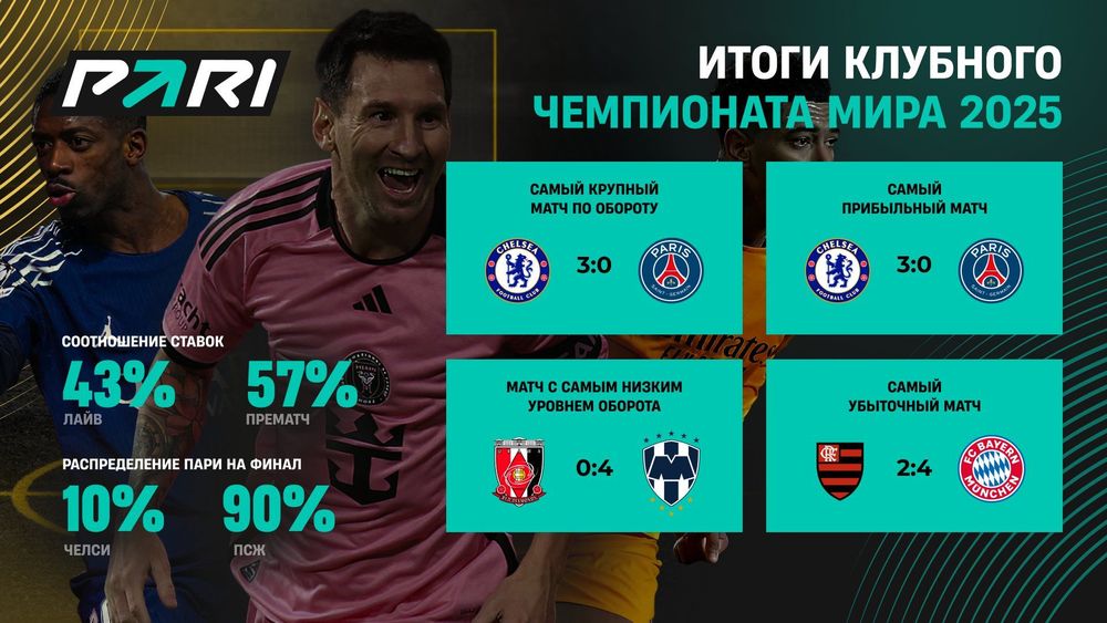 Самым прибыльным для PARI оказался финальный матч КЧМ-2025 между «ПСЖ» и «Челси», в котором парижане не оправдали ожиданий абсолютного большинства игроков и крупно проиграли со счетом 0:3.