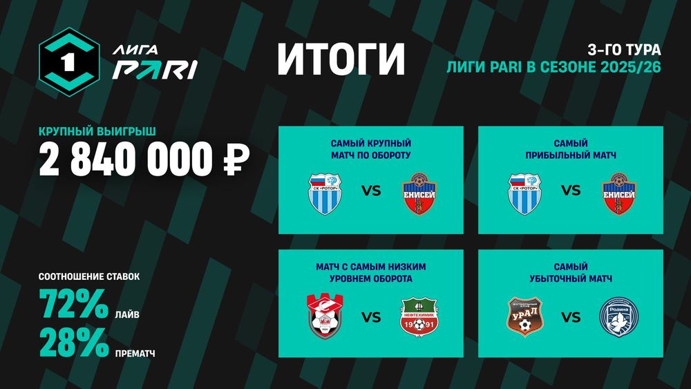 Самым крупным матчем по объему принятых ставок в третьем туре Лиги PARI стала встреча «Ротора» и «Енисея». На эту встречу пришлось 19% от всего оборота пари на игры третьего тура. Матч завершился безголевой ничьей 0:0.