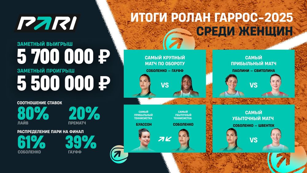 Наиболее прибыльным для PARI оказался матч четвертого круга, в котором украинка Элина Свитолина прошла итальянку Ясмин Паолини, игравшую в финале «Ролан Гаррос» — 2024 (4:6, 7:6, 6:1). На эту встречу пришлось почти 9% от всей прибыли, полученной компанией по итогам приема ставок на «Ролан Гаррос» среди женщин. Успешными для PARI оказались и уже упомянутые матчи Соболенко против Гауфф и Андреевой против Буассон.