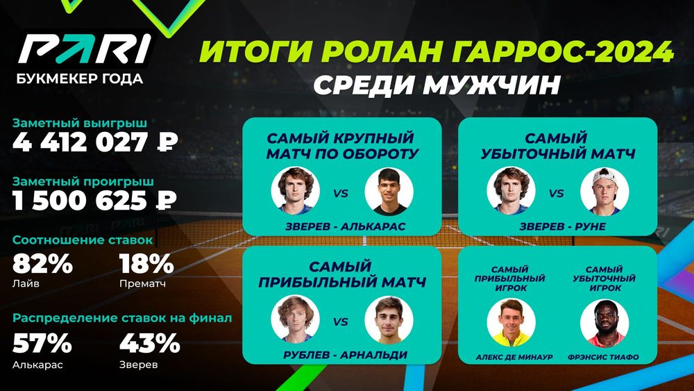 На пять самых популярных встреч «Ролан Гаррос» среди клиентов PARI приходится почти 19% от общей доли оборота ставок на матчи турнира. Самый большой объем пари пришелся на финальный матч Карлос Алькарас — Александр Зверев: около 5% от общего оборота. Испанец победил в пяти сетах.