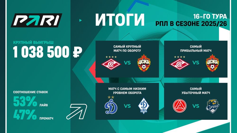 Больше всего ставок в денежном выражении PARI приняла на матч «Спартак» — ЦСКА. На эту встречу пришлось почти 22% от общего оборота пари на события 16-го тура. Вторым стал матч «Пари НН» — «Зенит» (почти 19%), а третьим — «Локомотив» — «Краснодар» (чуть менее 15%).