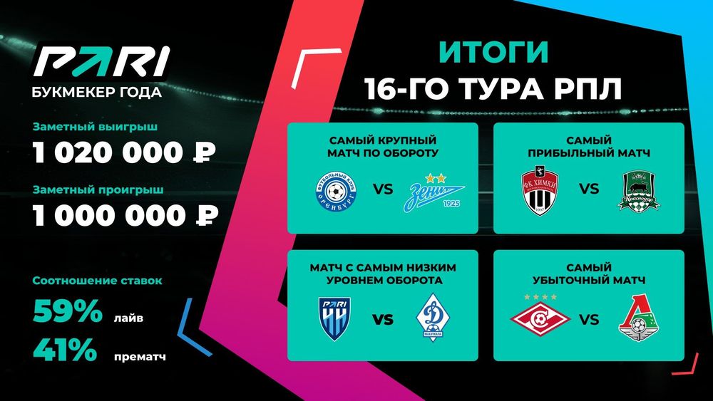 Наибольшую прибыль PARI получила благодаря матчу «Химок» с «Краснодаром». «Быки» считались фаворитами, и большинство игроков ставили на их победу. Удачными для компании также оказались исходы матчей «Пари НН» — «Динамо Махачкала» и ЦСКА — «Ростов». В свою очередь, клиенты PARI успешно прогнозировали развитие событий в таких поединках, как «Крылья Советов» — «Ахмат» и «Спартак» — «Локомотив».