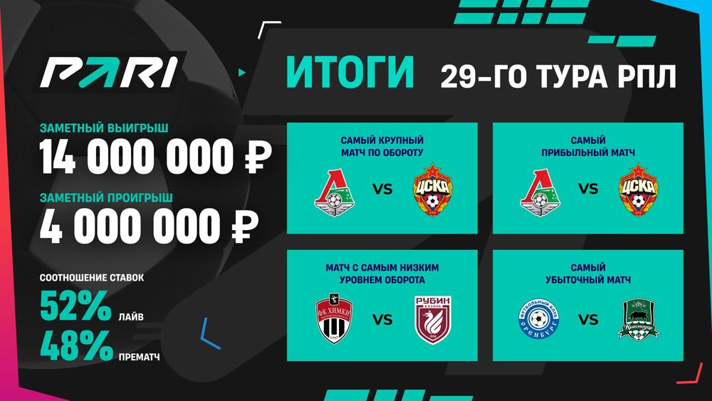 Наиболее удачными в плане прибыли для PARI оказались встречи «Локомотив» — ЦСКА, «Пари НН» — «Факел» (1:1) и «Ростов» — «Зенит». А вот клиенты компании смогли получить заметную прибыль на играх «Оренбург» — «Краснодар», «Ахмат» — «Динамо» Махачкала и «Крылья Советов» — «Спартак».