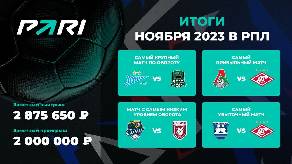 На ноябрь пришлись 14-й, 15-й и 16-й туры РПЛ. Директор по коммуникациям и устойчивому развитию букмекерской компании PARI Алексей Бабичев рассказал о ставках клиентов на Российскую Премьер-Лигу в ноябре 2023 года.