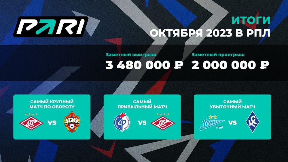 А вот по итогам матчей «Зенит» — «Крылья Советов», «Краснодар» — «Ростов», «Спартак» — «Пари НН» (2:0), «Урал» — «Локомотив» (2:2) и «Сочи» — «Зенит» (0:2) компания не получила желаемого результата: они были самыми убыточными событиями РПЛ для PARI в октябре.