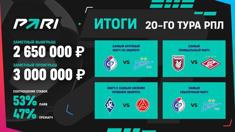 Наиболее прибыльным для PARI оказался матч «Рубина» со «Спартаком» — игроки в основном ожидали, что москвичи продолжат свою победную серию. Кроме того, компания зафиксировала высокий уровень прибыли по ставкам на встречи «Локомотив» — «Ахмат» и «Крылья Советов» — «Акрон».