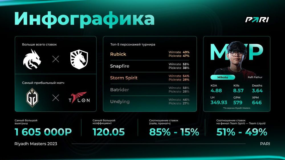 Самой популярной командой среди клиентов PARI на прошедшем Riyadh Masters стала Team Liquid — на матчи с участием финалиста приходится 11% от общего оборота ставок, принятых на турнир. Следом идут Gaimin Gladiators и 9Pandas, на каждой из которых — чуть больше 10% оборота. Замыкают пятерку самых популярных команд Team Spirit и Talon Esports — они привлекли 9% и 8% оборота соответственно.