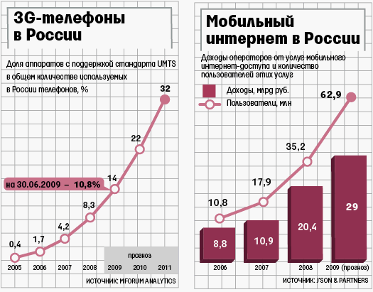Директор департамента МТС по развитию продуктов и услуг Павел Ройтберг считает, что если операторам «большой тройки» удастся без серьезных ограничений запустить сети третьего поколения в Москве, то доходы от оказания услуг мобильного интернет-доступа в столице могут достичь 25–30 млрд руб. в 2010 г. А в целом по России рынок вырастет с 40 млрд в 2009 г. до 60 млрд руб. (с учетом «Скай линка» и WiMax-оператора «Скартел»), добавляет Ройтберг. Представители «Вымпелкома» и «Мегафона» свои прогнозы не раскрывают. Корнеева лишь замечает, что оценки аналитиков J’son & Partners, ожидающих, что рынок вырастет до 29,3 млрд руб. по итогам 2009 г., «похожи на правду».