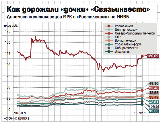 «Центртелеком», ЮТК и «Волгателеком» стали лидерами среди «дочек» «Связьинвеста» по темпам роста котировок в конце 2009 – начале 2010 г. Как раз тогда Ernst & Young, нанятая «Связьинвестом» для оценки стоимости его «дочек», начала рассчитывать коэффициенты обмена их акций, и участники рынка немедленно заподозрили: акции МРК скупает кто-то из инсайдеров. А к лету 2010 г. стало известно, что акции многих «дочек» «Связьинвеста» оказались под контролем Газпромбанка. Утверждалось, что бумаги приобретаются в интересах «клиента».