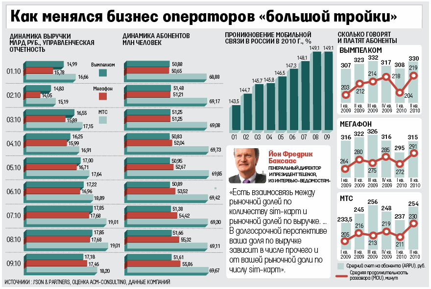 В сентябре «Мегафон» впервые обошел «Вымпелком» по доходам от сотовой связи в России и занял 2-е место после МТС. Такие данные содержатся в исследовании аналитической компании J’son & Partners (есть у «Ведомостей»). Подлинность документа «Ведомостям» подтвердили источник, близкий к «Мегафону», и менеджер одной из телекоммуникационных компаний. Об этом исследовании слышал и сотрудник одного из инвестбанков.