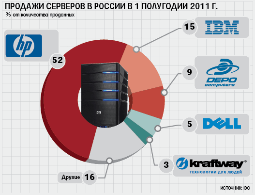 В пятерку основных поставщиков серверов в России входят также американская Dell и российская Kraftway. «Мы в последнее время зарабатываем больше на интеграционных проектах на базе компьютерных устройств, например инфоматов или терминалов», – говорит гендиректор Kraftway Алексей Кравцов. По его словам, Kraftway часто разрабатывает специальные устройства под заказчиков, а также создает специальные защищенные материнские платы для их компьютеров.