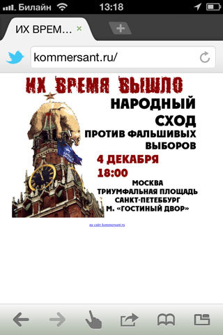 Сайт издательского дома "Коммерсант" около полудня в четверг подвергся хакерскому воздействию, в результате которого части пользователей, заходивших на сайт, показывалась полноэкранная картинка с белым медведем на Спасской башне и с текстом о «народном сходе против фальшивых выборов" в Санкт-Петербурге и Москве. По состоянию на 19.30 проблема все еще не была решена: сайт либо не открывается, либо демонстрирует картинку, загруженную злоумышленниками.