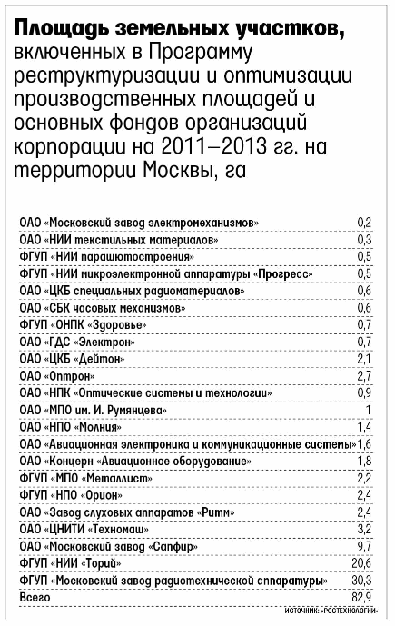 У «Ростехнологий» в городе почти две сотни организаций, которые располагаются на 243,2 га (подробнее см. врез на стр. 03). Часть этих активов госкорпорация намерена реструктурировать в 2012–2013 гг., говорит замглавы департамента «Ростехнологий» Максим Василевский. По его словам, речь идет о предприятиях, которые располагаются на 82,9 га в 243 зданиях общей площадью 602 000 кв. м (список объектов с адресами см. на www.vedomosti.ru).