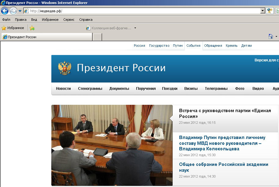 При заходе на кириллический адрес интернет-сайта бывшего президента России Дмитрия Медведева медведев.рф открывается сайт нового президента Владимира Путина (см. иллюстрацию). Этот сайт, по данным сервиса Whois, зарегистрирован на организацию «Спецсвязь ФСО РФ» — одного из крупнейших получателей кириллических доменных имен. В ее распоряжении также домены кремль.рф и путин.рф. Регистрация домена медведев.рф заканчивается в марте 2013 г.