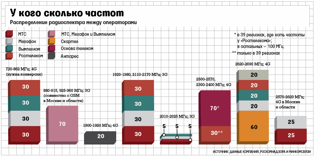 Операторы «большой сотовой тройки» не используют часть выделенного им частотного ресурса для сетей 3G, выяснили «Ведомости»: по всей стране простаивает полоса шириной 15 МГц в диапазоне 2010–2025 МГц. Сейчас этот ресурс не используется, подтвердили представители МТС, «Мегафона» и «Вымпелкома», объяснив это отсутствием необходимого оборудования.