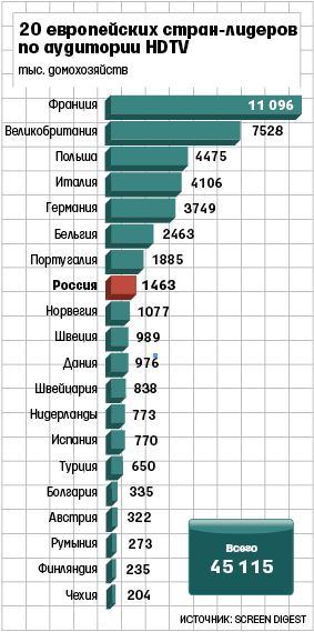 Всего в Европе к началу 2013 г., по данным этой компании, насчитывалось 45,1 млн подписчиков HDTV – на 12 млн больше, чем годом ранее.