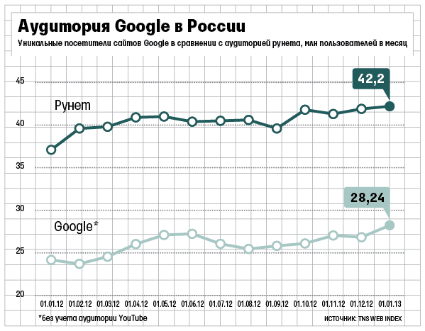 С декабря 2011 г. по декабрь 2012 г. месячная российская аудитория Google(с учетом видеосервиса YouTube) выросла на 16,8% до 31,06 млн пользователей, следует из данных TNS Web Index. Это лучшая динамика среди крупнейших компаний рунета. Второй по темпам роста аудитории оказалась «В контакте»: за год ее месячная аудитория увеличилась на 14,6% до 29,4 млн пользователей. Аудитория «Яндекса» за тот же период выросла на 11,7%, социальной сети «Одноклассники» – на 11,3%, Mail.ru – на 11,2%, Rambler – 3,8%.
