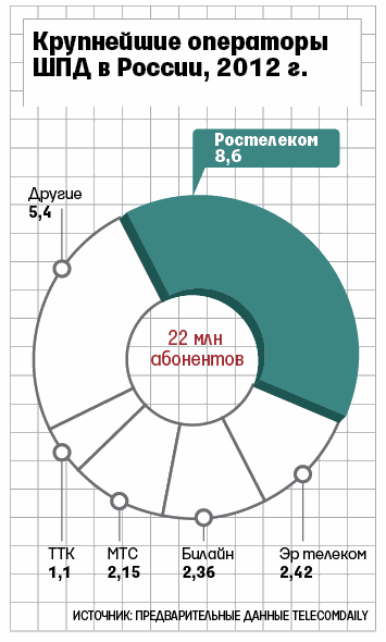 Руководство «Вымпелкома» давно обсуждает возможность выделения розничного ШПД-бизнеса в отдельную компанию и даже его продажи, рассказывали раньше источники «Ведомостей». Фиксированный ШПД требует инвестиций, но их возврат на нынешнем уровне развития рынка невысок, объясняли они. Успехи «Вымпелкома» в сегменте ШПД не впечатляют: по предварительным данным iKS-Consulting и Telecomdaily, в IV квартале 2012 г. оператор уступил 2-е место по количеству абонентов «Эр-телеком холдингу» (см. рисунок). По данным iKS-Consulting, в 2012 г. «Эр-телеком» набирал абонентов в разы быстрее «Вымпелкома»: если в I квартале «Вымпелком» подключил 15 000 абонентов, а «Эр-телеком» – 114 000, то во II квартале прирост составлял 31 000 и 140 000, а в III квартале – 39 000 и 136 000 соответственно. В итоге уже к концу ноября у «Эр-телекома» было, по расчетам Telecomdaily, 2,37 млн абонентов фиксированного ШПД, а у «Вымпелкома» – 2,33 млн.
