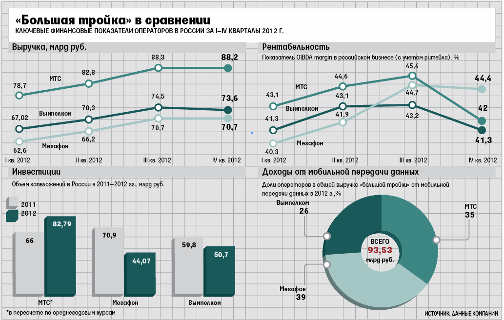 Лидером «большой тройки» по выручке от мобильной передачи данных остается «Мегафон». Активное строительство сетей 3G в России совпало по времени с финансовым кризисом 2008 г., и «Мегафон» оказался в лучшей форме, чем конкуренты: он не платил дивидендов, почти не брал долгов и подошел к кризису с хорошим запасом наличности. Лишь к концу 2012 г. МТС превзошла «Мегафон» по числу базовых станций 3G – 28 500 и 28 000 соответственно (у «Вымпелкома» – 18 600).
