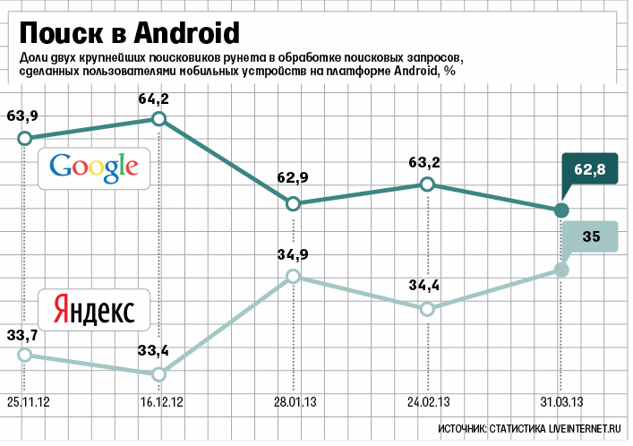 В конце марта 2013 г. «Яндекс» нарастил долю в поисковых запросах пользователей рунета, свидетельствуют данные сервиса статистики Liveinternet.ru, приведенные в отчете аналитиков «Ренессанс капитала». Доля «Яндекса» в последнюю неделю марта составила 62,2% при средней за прошлый месяц доле в 61,9% и за I квартал 2013 г. в 61,6%; это на 1,8 п. п. больше, чем за аналогичный период 2012 г. Доля второго в рунете и крупнейшего в мире поисковика Google составила 25,7% и оказалась ниже средних показателей за март (26%) и за I квартал (26,1%).