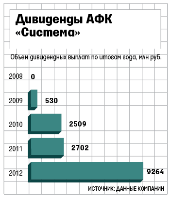 Совет директоров АФК «Система» рекомендовал выплатить ее акционерам дивиденды за 2012 г. на 9,264 млрд руб., сообщила вчера компания. Это в 3,4 раза больше, чем акционеры получили год назад: 2,7 млрд руб. На каждую обыкновенную акцию АФК ее совет рекомендует начислить по 0,96 руб. против 0,28 руб. годом ранее.
