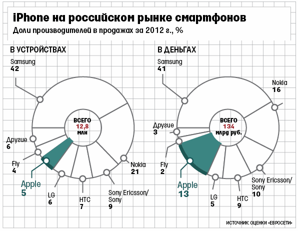 Продажи iPhone в России начались осенью 2008 г. Тогда прямые контракты с Apple заключили все операторы «большой тройки». За год они продали 300 000 устройств – существенно меньше, чем обещали (МТС обязалась продать около 1,3 млн iPhone до октября 2011 г., «Вымпелком» – 1,5 млн до конца 2010 г., а «Мегафон» – 1 млн до августа 2010 г.). «Мегафон» разорвал соглашение с Apple еще в 2010 г., МТС – в 2012 г. Пресс-секретарь МТС Ирина Агаркова не исключает возвращения к переговорам с Apple, но пока их нет. Не ведет переговоров и «Мегафон», говорит его представитель Юлия Ганина. В ноябре 2012 г. статус официального реселлера iPhone получил «Связной», его официальный представитель вчера не ответил на запрос.