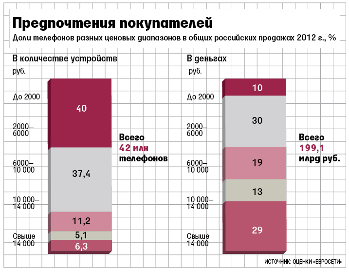 Розничная сеть МТС к средней ценовой категории относит смартфоны стоимостью 5000–15 000 руб., а «Евросеть» – аппараты за 5000–10 000 руб. Едины дилеры в одном: устройства этой категории – самые востребованные. По данным МТС, в 2012 г. на такие аппараты пришлось 58% всех продаж смартфонов в России (в штуках), по оценке «Евросети» – 39%.