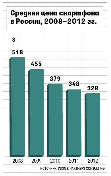 Впрочем, смартфоны постепенно дешевеют. По прогнозам аналитической компании Informa Telecoms & Media, к 2017 г. доля дорогих смартфонов в общих мировых продажах этих устройств снизится с 85% в 2011 г. до 33%. А дешевые смартфоны займут к этому времени более 52% рынка. Еще в 2011 г. средняя цена смартфона составляла $188, а к 2017 г. она снизится до $152. Самые дешевые смартфоны в 2012 г. уже стоили в среднем около $150, самые дорогие – более $250.