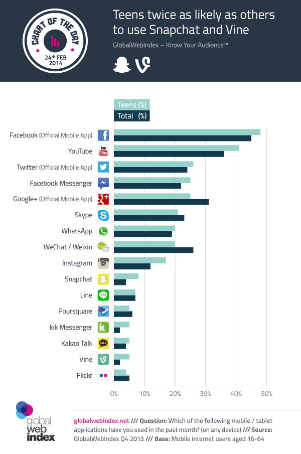 Мобильное приложение Facebook остается самым популярным среди молодых пользователей интернета 16-19 лет - в IV квартале 2013 г. им пользовалось 48% аудитории, следует из данных аналитической компании GlobalWebIndex. Тем не менее подростки все чаще пользуются новыми мобильными приложениями вроде Instagram, Vine и Snapchat. Хотя общий размер аудитории Snapchat и Vine остается относительно небольшим по сравнению с аудиторией Facebook, YouTube и Twitter, интересно, что подростки используют именно эти приложения вдвое чаще, чем взрослые пользователи, говорится в сообщении GlobalWebIndex.