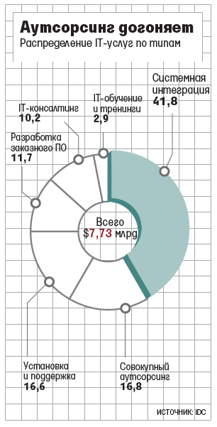 Российский рынок IT-услуг в 2013 г. вырос на 8%, его объем составил $7,7 млрд, говорится в отчете исследовательской компании IDC. По предварительной оценке, IT-услуги занимают 22% всего IT-рынка России, добавляет представитель IDC Сергей Логинов. Исходя из этих цифр вся российская IT-индустрия заработала в 2013 г. около $35,15 млрд (1232 млрд руб. по курсу ЦБ на 26 июля). Общий объем IT-рынка будет еще уточняться в течение месяца, до выхода отчета по рынку в целом, сообщает представитель IDC.