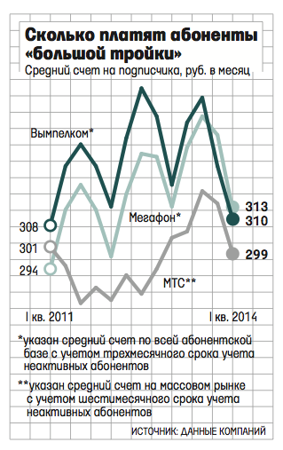 По закону оператор может поменять условия тарифного плана, уведомив его подписчиков не менее чем за 10 дней через СМИ. Обычно операторы вносят коррективы как можно менее заметно, так что многие абоненты узнают об изменениях в тарифном плане постфактум, говорит Кусков: новости на сайтах операторов (которые тоже зарегистрированы как СМИ) более или менее активно читают менее 3% абонентов. За тем, что происходит с их тарифами, следят около 10% абонентов, считает Половников. Поэтому весьма вероятно, что пересмотр цен на архивных тарифных планах поможет оператору увеличить доходность этих подписчиков - абоненты не сразу заметят изменения в своих тарифных планах, предполагает аналитик Райффайзенбанка Сергей Либин. Рост стоимости тарифа на 20% напрямую повлияет на выручку и может обеспечить некоторый прирост среднего счета на абонента (ARPU) «Мегафона» как минимум в краткосрочной перспективе, отмечает он. В последние несколько кварталов ARPU «большой тройки» снижался (см. график). А на архивных тарифных планах, как правило, сидят абоненты, для которых цена не так критична, и они могут позволить себе тратить на связь лишние 100-200 руб. в месяц, говорит Либин.