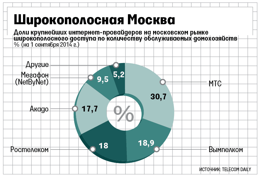К началу сентября «Ростелеком» обслуживал 735 000 пользователей широкополосного интернет-доступа (ШПД) в Москве (включая территории, вошедшие в черту города с 1 июля 2012 г., так называемую новую Москву), следует из данных информационно-аналитического агентства Telecom Daily. Оператор впервые превзошел по этому показателю «Акадо телеком», у которого пользователей было 725 000. С начала III квартала 2014 г. «Ростелеком» приобрел 14 000 новых московских абонентов, а «Акадо» - лишь незначительное количество, следует из статистики Telecom Daily. Эта статистика учитывает абонентов не только самого «Ростелекома», но и его дочернего «Центрального телеграфа», и тех, кого ранее обслуживали «Национальные кабельные сети», влившиеся в «Ростелеком» (бренд Onlime), уточняет гендиректор Telecom Daily Денис Кусков.