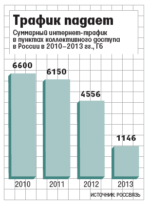 Использование ПКД гражданами стабильно падает (см. график). По данным Россвязи, за 2013 г. суммарный трафик во всех ПКД упал почти вчетверо - до 1146 Гб, или до 56 Мб в год на один ПКД. Представители «Почты России», Россвязи и «Ростелекома» не говорят, каков трафик в ПКД почты. Если предположить, что в 2014 г. трафик в ПКД не падал и распределялся равномерно по сезонам и операторам ПКД, то на возмещение затрат на передачу 1 Гб трафика в ПКД уходит около 2,2 млн руб.