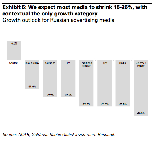 Девальвация рубля составила 47% за последние шесть месяцев, и экономисты инвестбанка ожидают, что этот процесс продолжится в ближайшее время. На фоне ожидания снижения потребительского спроса и инфляции рекламодатели, скорее всего, будут неохотно распределять бюджеты на рекламу в России. В связи с этим Goldman Sachs ожидает, что в 2015 г. весь российский рекламный рынок упадет на 15% по сравнению с 2014 г.