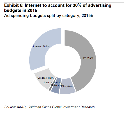 В 2015 г. интернет останется единственным растущим медиа в стране, следует из отчета инвестбанка Goldman Sachs. Продажи рекламы во всех остальных медиа, включая телевидение, упадут на 20-30%.