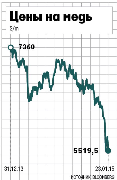 Медь на LME дешевеет (см. график), но медленнее, чем рубль: с 1 сентября по 30 декабря 2014 г. курс рубля по ЦБ снизился по отношению к доллару на 34,4%, а цена на медь - только на 8,61%.