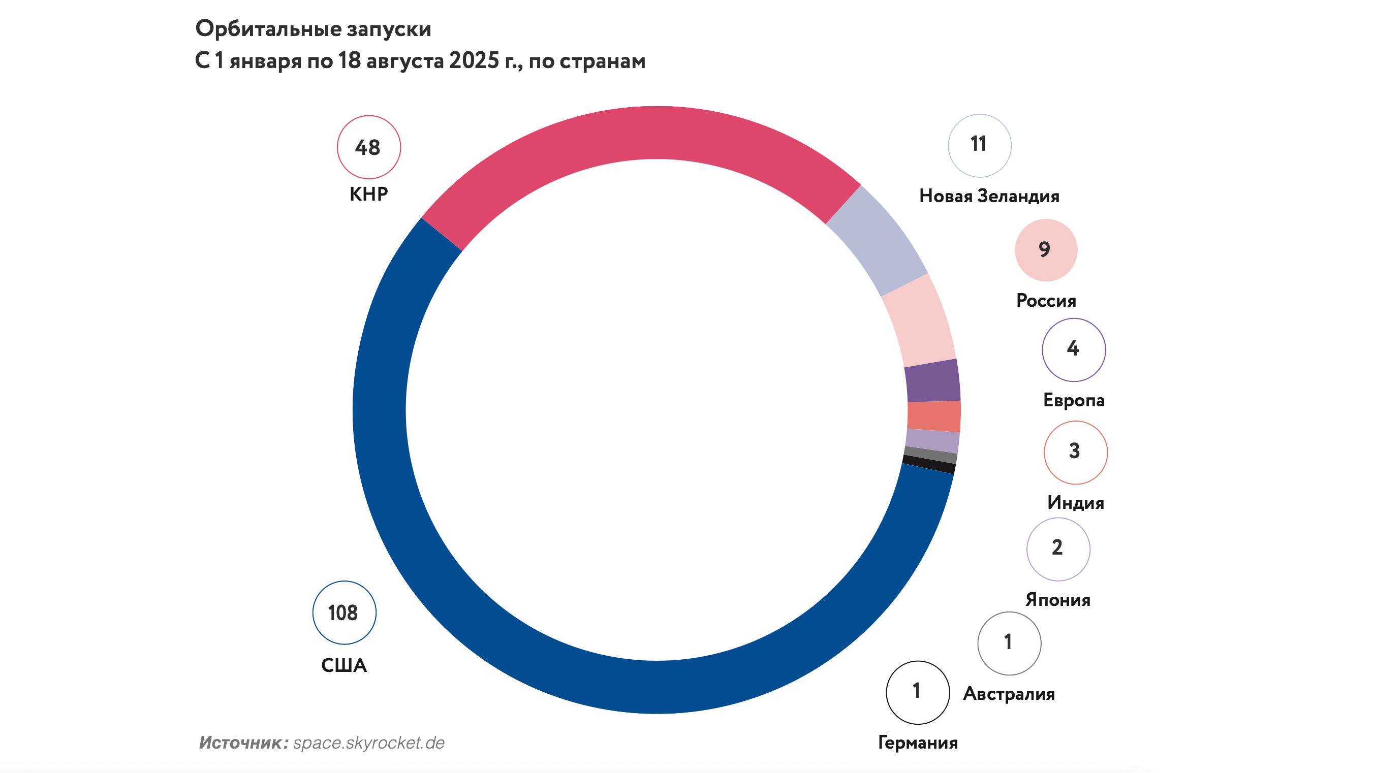 Происходит резкое ускорение темпов освоения околоземного пространства и еще быстрее происходит концентрация активности в двух лидирующих странах – США (почти 60% запусков с начала 2025 г.) и Китае (более 25%).