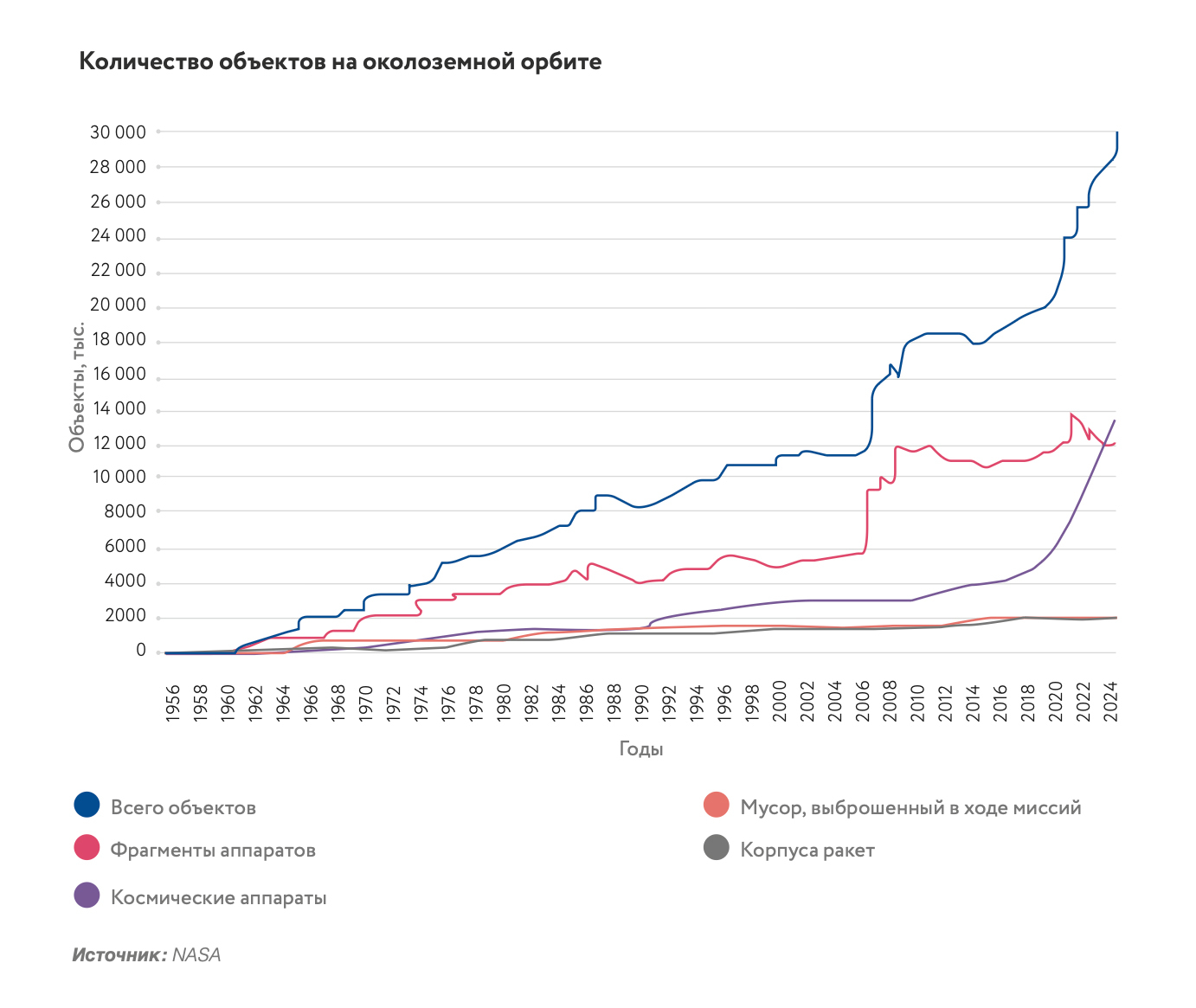 По данным Европейского космического агентства на июль 2025 г., с начала космической эры в 1957 г. произведено около 6990 запусков ракет, на околоземную орбиту выведено около 22 740 спутников. На середину 2025 г. на орбите находится около 15 050 объектов, из которых лишь 12 300 – функционирующих, а прочие представляют из себя космический мусор, создающий проблему для эффективного функционирования будущих спутниковых созвездий. Кроме того, массовый сход с орбиты спутников приводит к выбросу в атмосферу оксида алюминия – вещества, разрушающего озоновый слой.